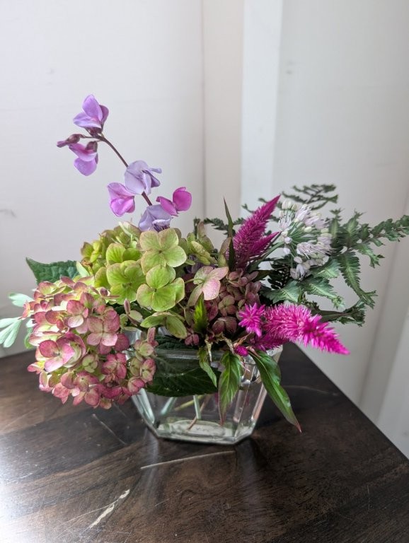 I confess during the bleak winter months I go a bit stir crazy having nothing to create. So a few years back I started playing with flowers. I put together arrangements for clients and neighbors and found out that I loved the process. The same design principles I incorporate with my containers – scale, balance, harmony, and contrast- work with floral design. Also, like container gardening, floral design can accommodate many different styles. Some arrangements are more linear and modern while others are more flowy and organic. Whether containers or floral design I love the fact that each arrangement I create is unique to my client and his/her aesthetic.